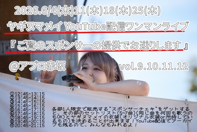 6/4(木) アプロ赤坂 ヤギヌマメイ YouTube配信ワンマンライブ 『 ご覧のスポンサーの提供でお送りしますvol.9 』 ①12:45-13:15 ②13:45-14:15 ③14:45-15:15 ④15:45-16:15 ⑤16:45-17:15 ⑥17:45-18:15 ⑦18:45-19:15 ⑧19:45-20:15 ⑨20:45-21:15 自分がスポンサーの枠へ来場希望の場合は、当日プラスで¥2000(1D込)現地支払いにて可能です。(備考欄に記入お願いします) 現地観覧は、時間の都合上特典会はございません。 フロアが散らかっている場合がございます。ご了承ください。 YouTube https://youtube.com/channel/UC0U3iVHvh6mN18TfnbGh8mA 各部1人限定で販売する"スポンサーチェキ"をゲットすると、その部のセットリスト(5~7曲)(同じ曲を何回も歌うのもOK)とヤギヌマメイの衣装(オリジナル衣装or所持しているもの)を決めることが出来ます!YouTube配信でアーカイブも残るので、みんなもみれるよ! ライブ当日のソロチェキ1枚をお届け!(来場可能な方は2shotも可能) ※ 備考欄に"ご希望の楽曲(合計25分以内)"と"ご希望の衣装"を記入してください。